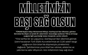 TÜRSAB Başkan Adayı Muhammed Akkaya,Azerbaycan’dan ülkemizegelirkenGürcistan’da düşen ve içinde 20askerimizinbulunduğu açıklanan TSK’ya ait kargo uçağıyla ilgili yayınladığı taziye mesajındaşunları aktardı.